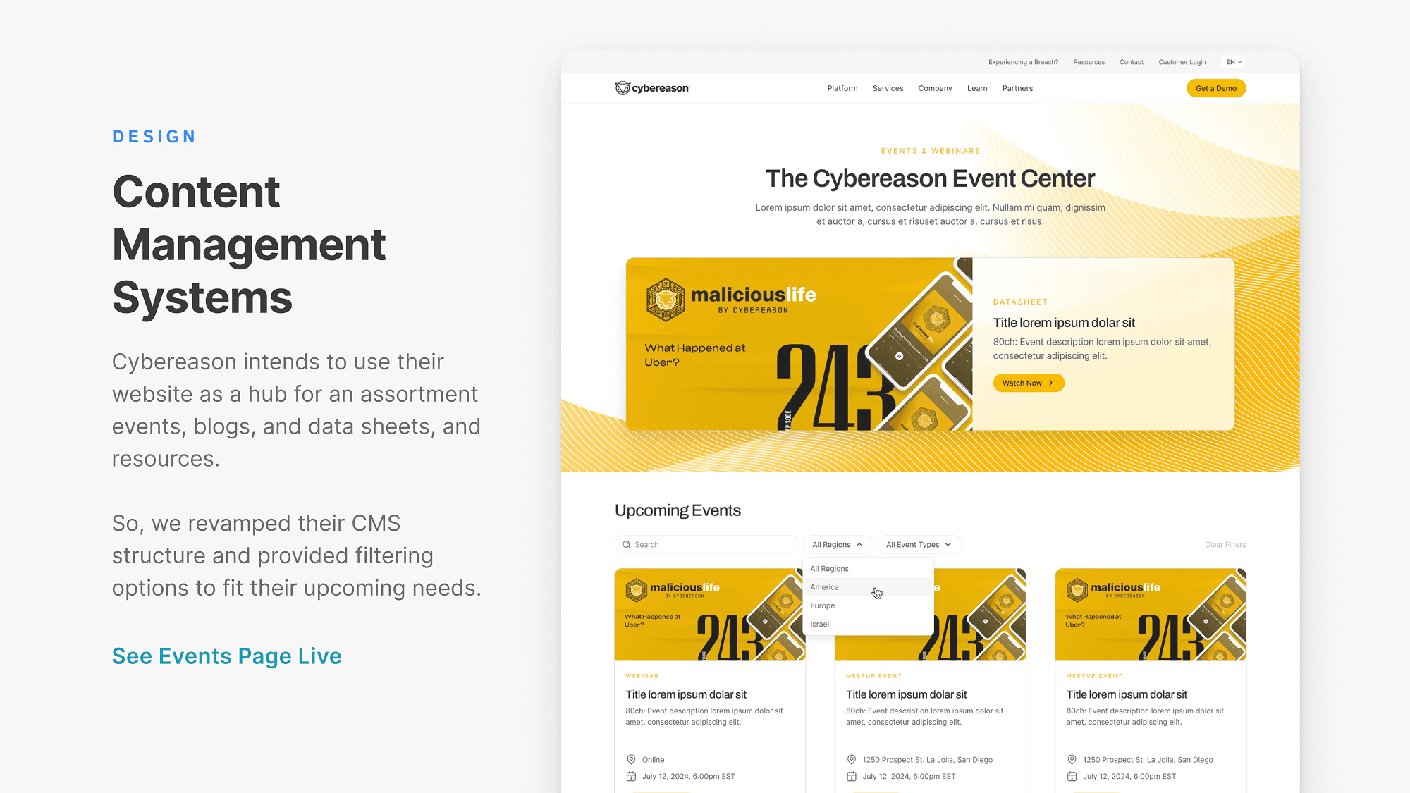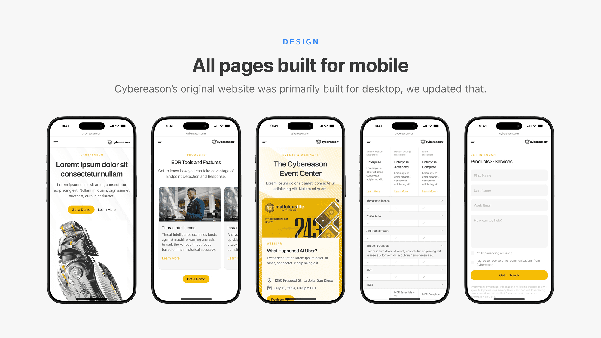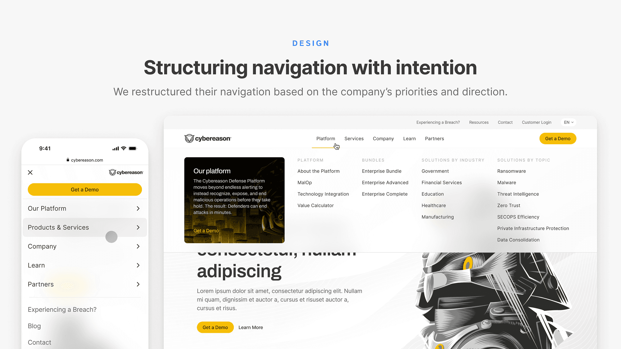 Simplify the site’s information architecture, improve accessibility, and clarify the primary call-to-action. The Cybereason website hosts a behemoth of information, complete with confusing acronyms, technical terminology, and heavily cluttered infographics. It was my job make sure that important product and service information was easily understandable and findable for visitors.