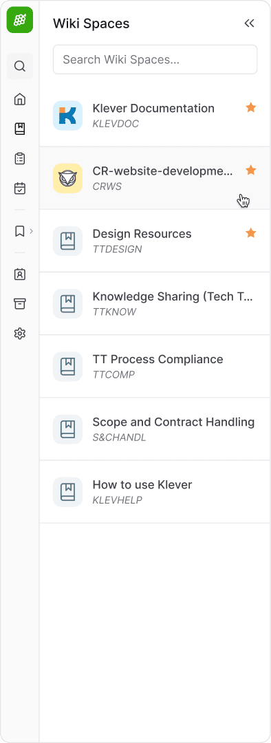 Klever is an in-house project management platform with Wiki, Projects, and ToDo, serving as the central hub for collaboration, sprints, assignments, notes, and technical guides.