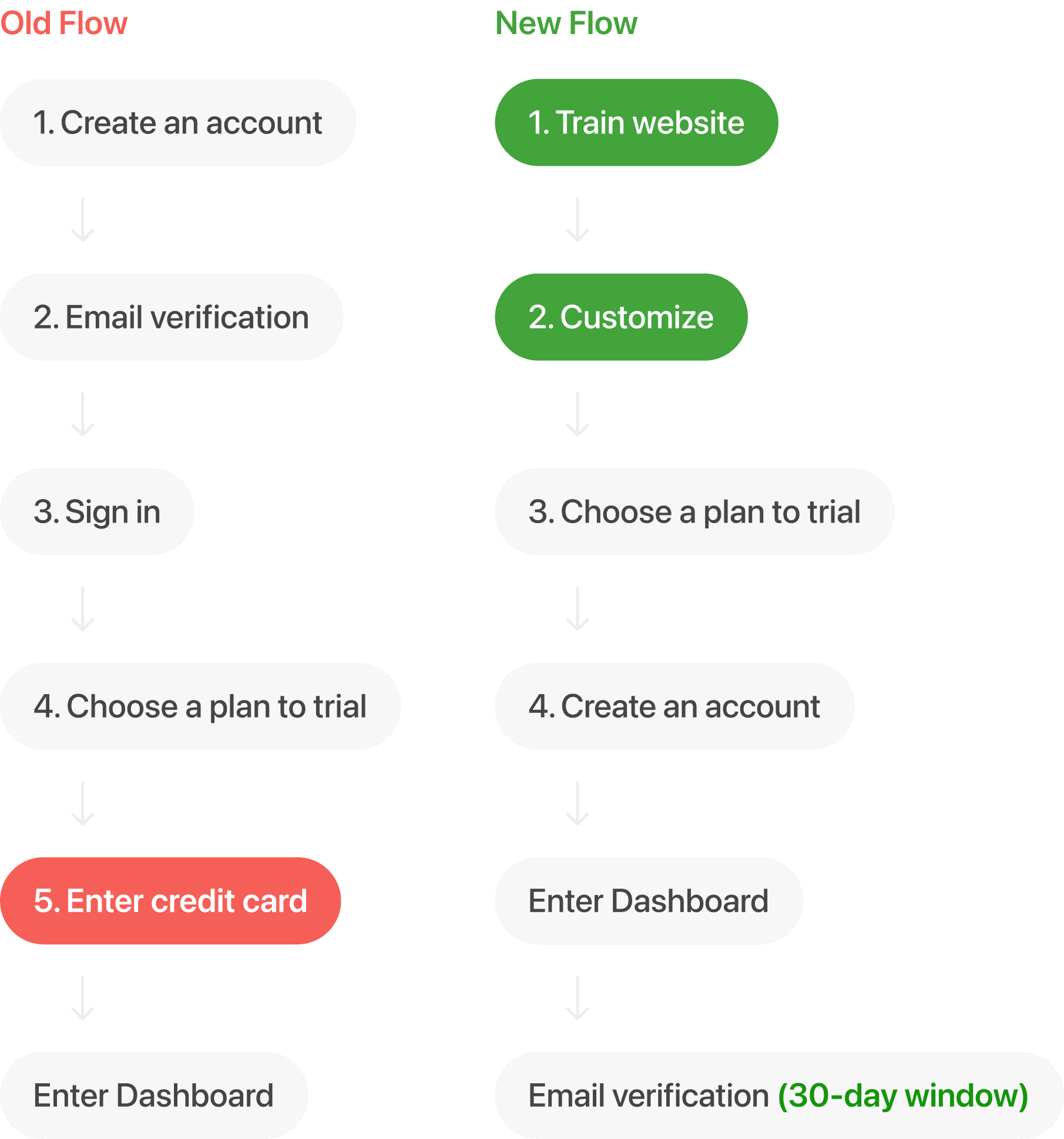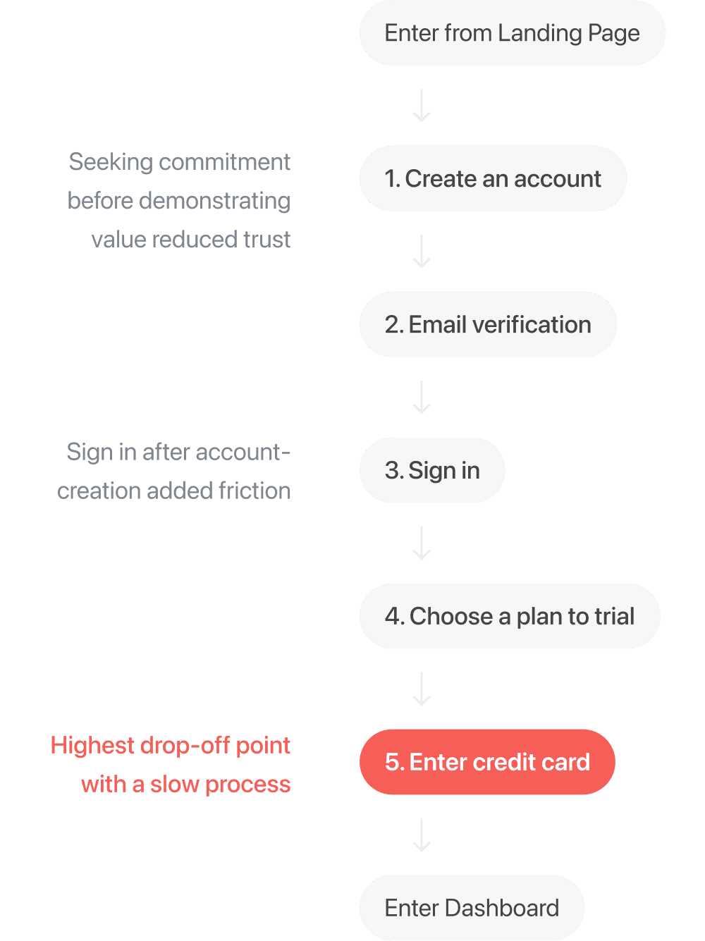 Leadership worried that removing the paywall would attract low-quality leads and reduce conversion intent. I proposed delaying the paywall until after the 30-day trial, emphasizing the importance of user-trust and arguing that users who already verified the product on their own site would be far more qualified than those who simply created an account.