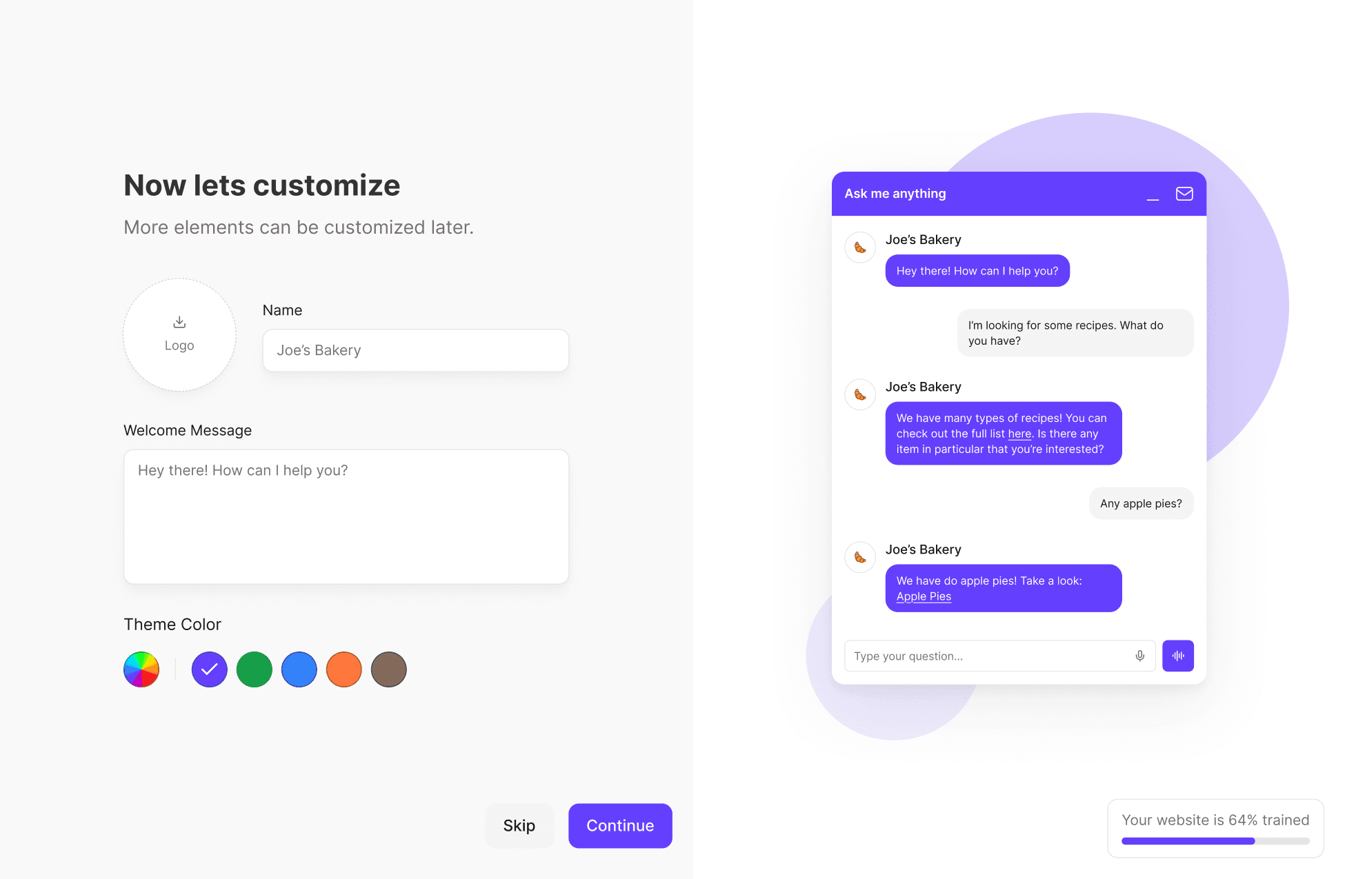 AI training took 4–5 minutes, which risked high drop-off if users faced a blank loading state during onboarding. Along with the limit of scraped pages, I turned this wait time into a customization phase, allowing users to style their bot’s name, colors, and visual identity while training ran in the background.