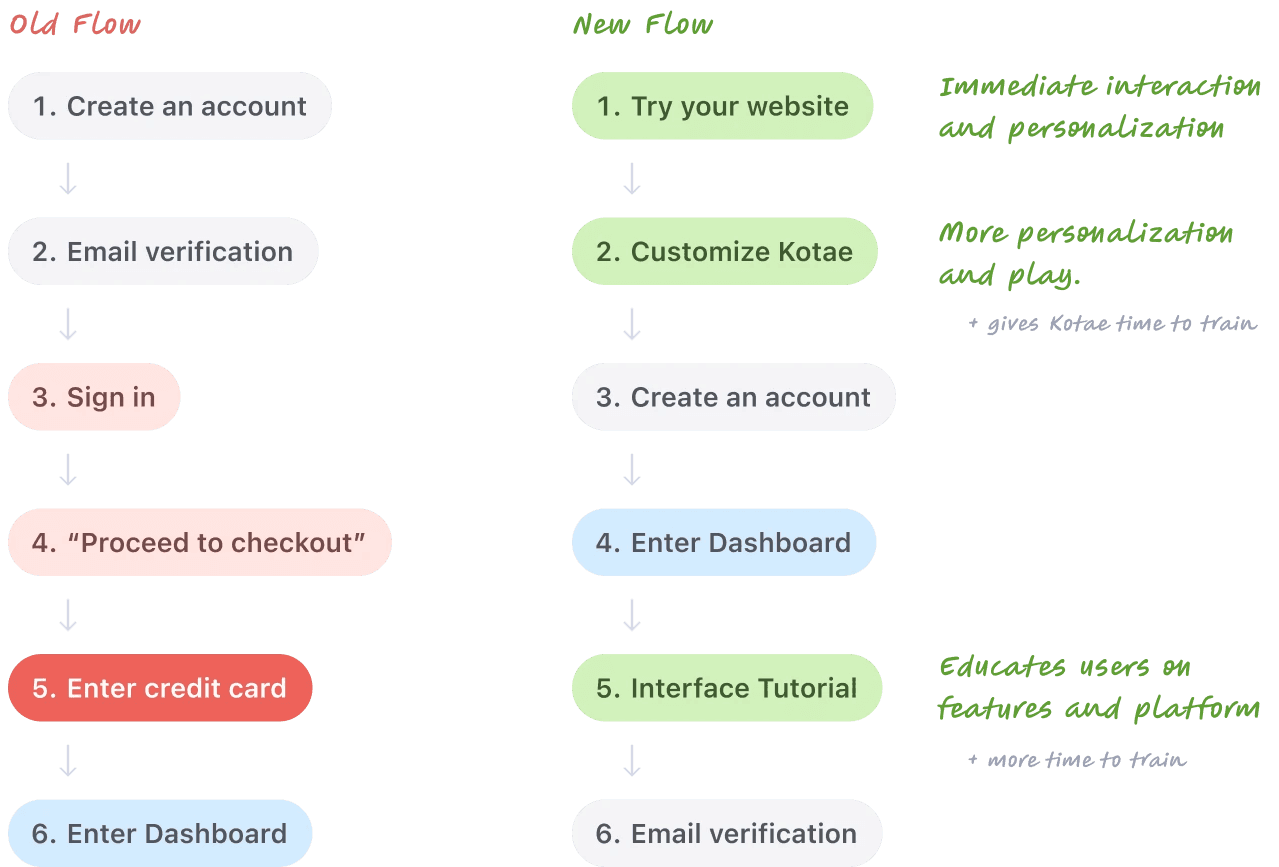 After observing major areas of drop-off in the original onboarding flow, we zoomed into each step and reimagined its experience to create an enjoyable, personable, low-commitment first-time experience with Kotae. So we ensured that each step included a degree of interaction, vivid color,